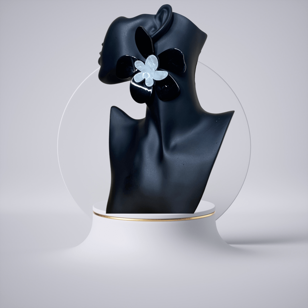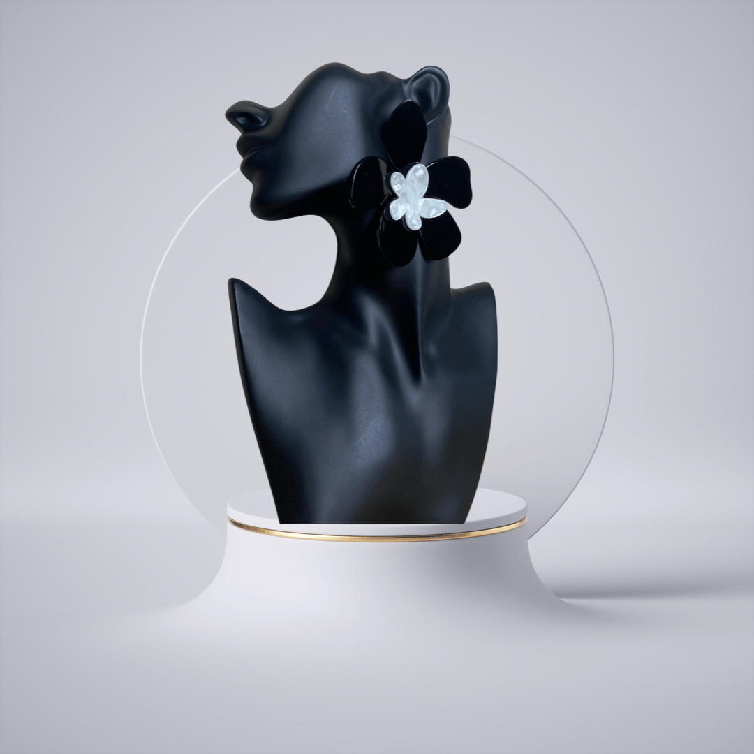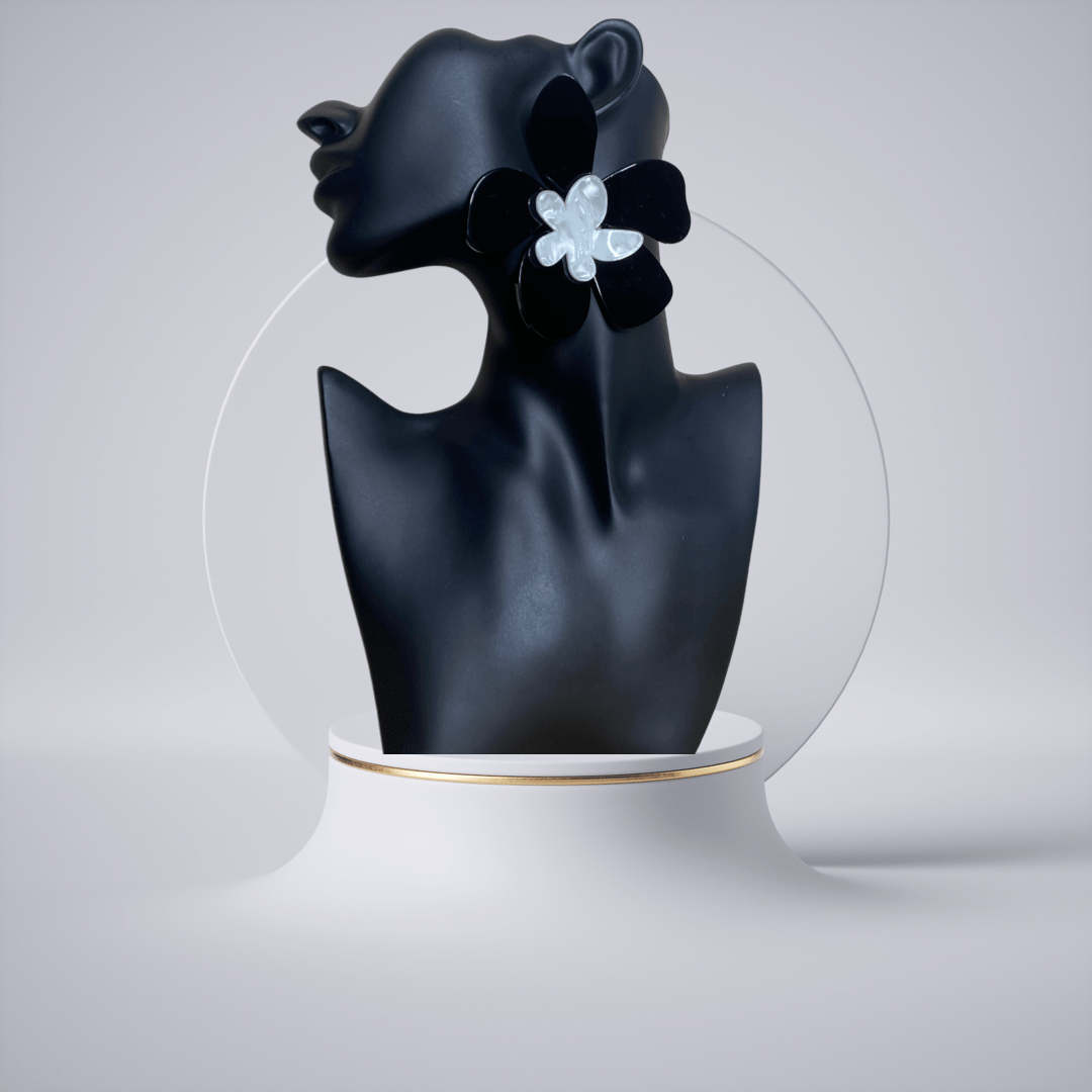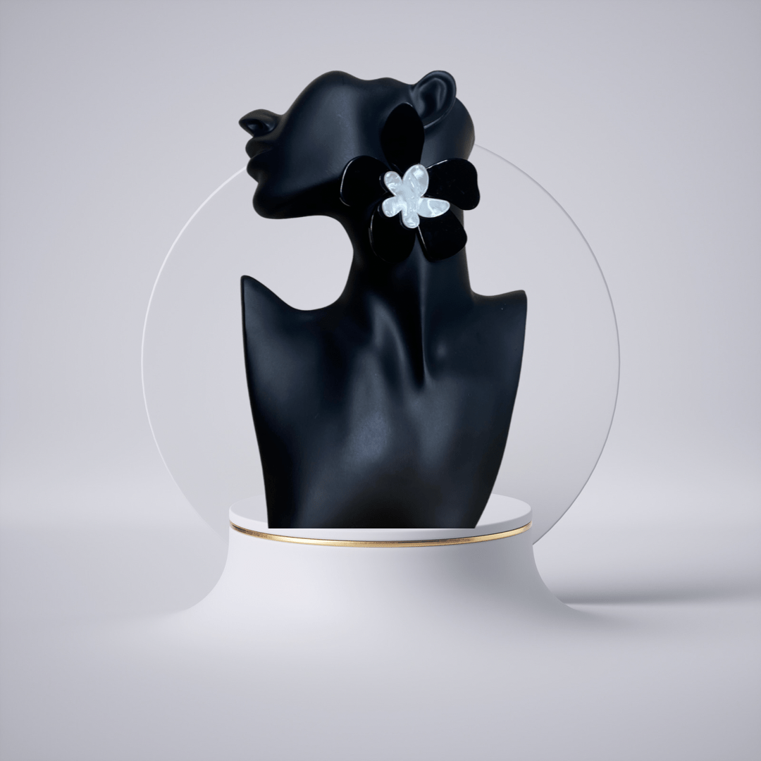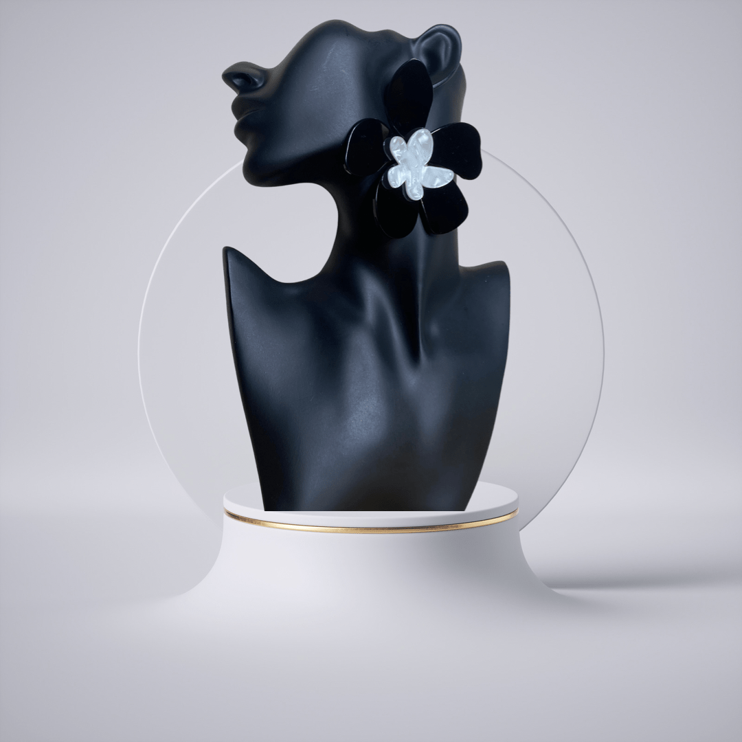 Add a little edge and a finishing touch to your outfits with these earrings babe. Featuring an onyx and white acrylic textured material in a flower style, how could you resist?