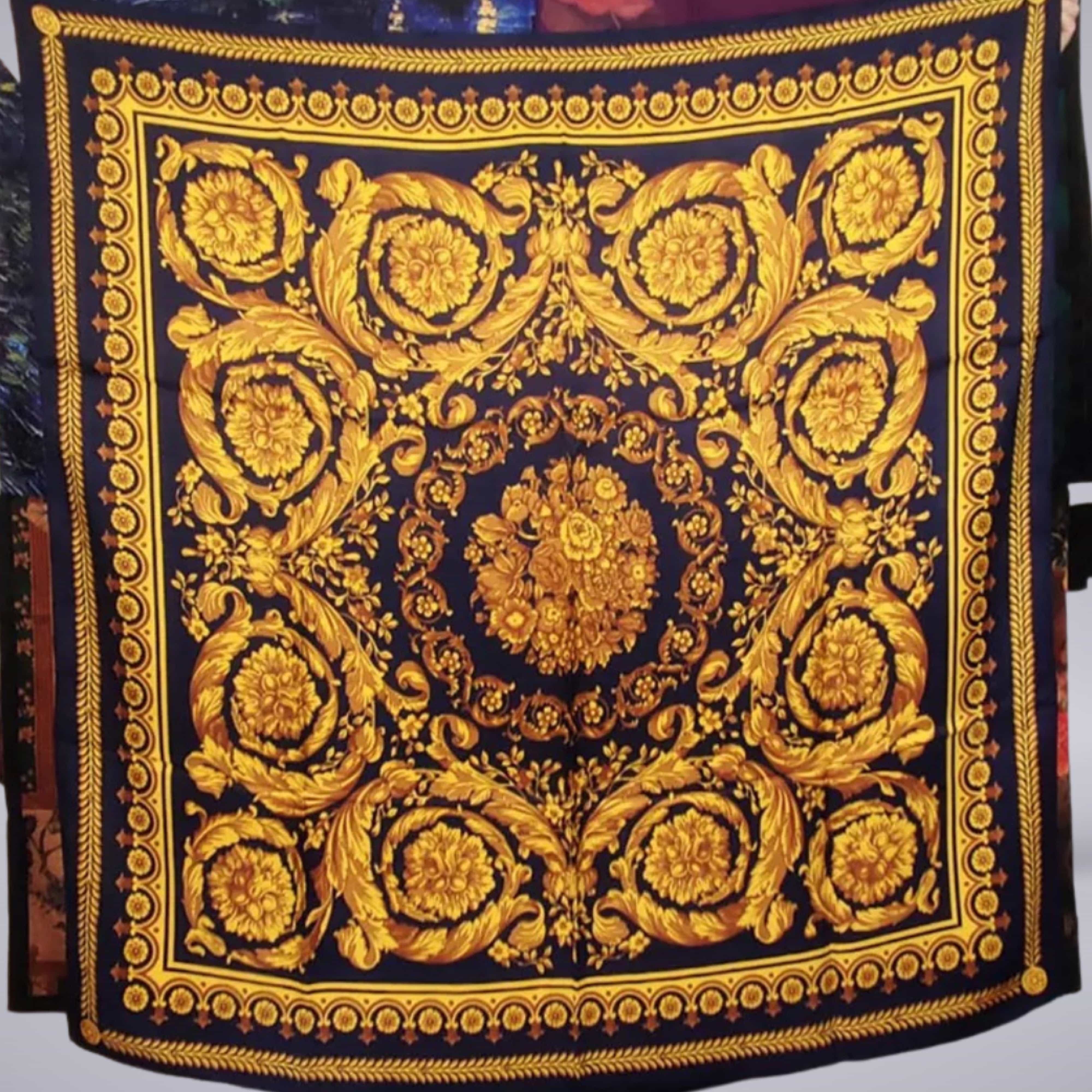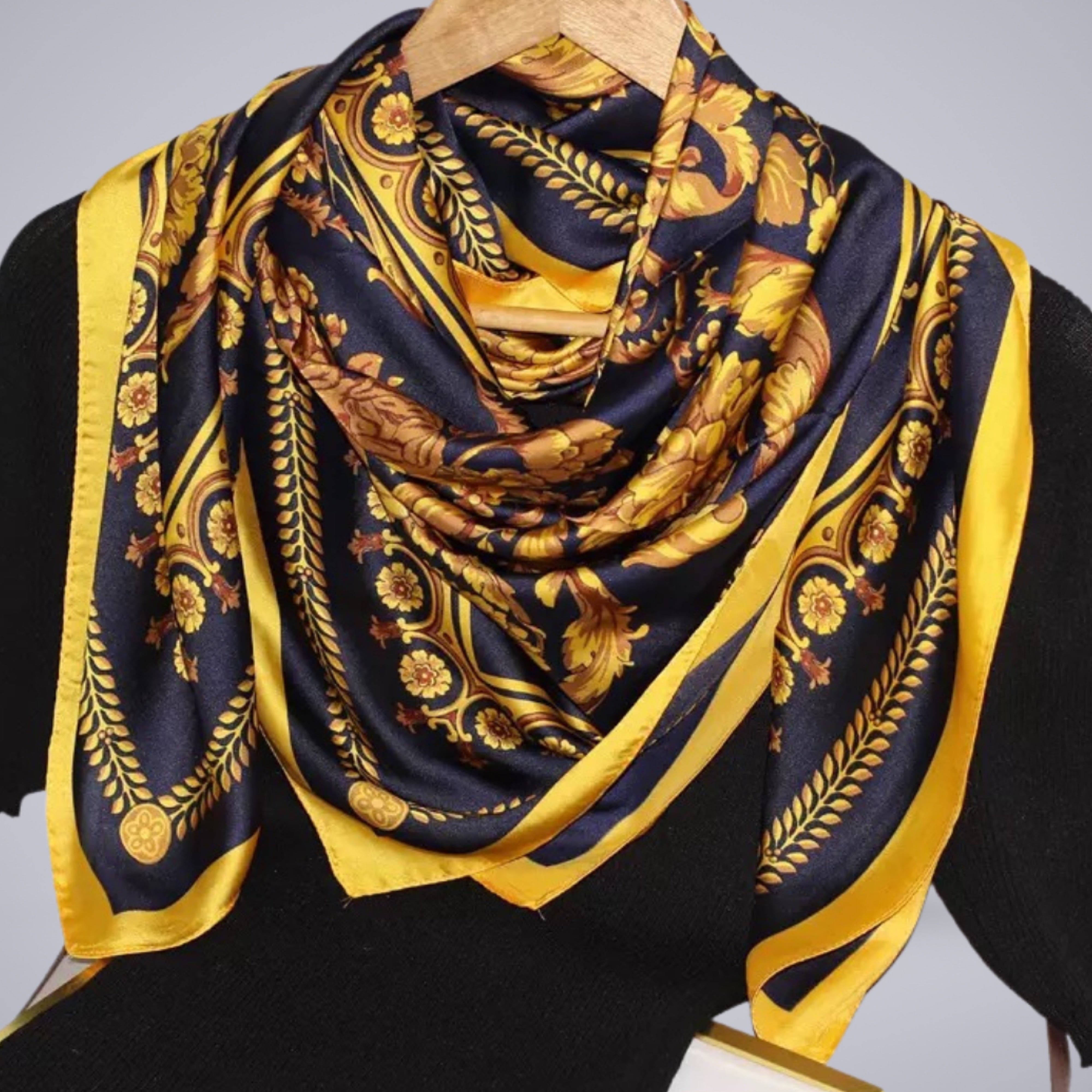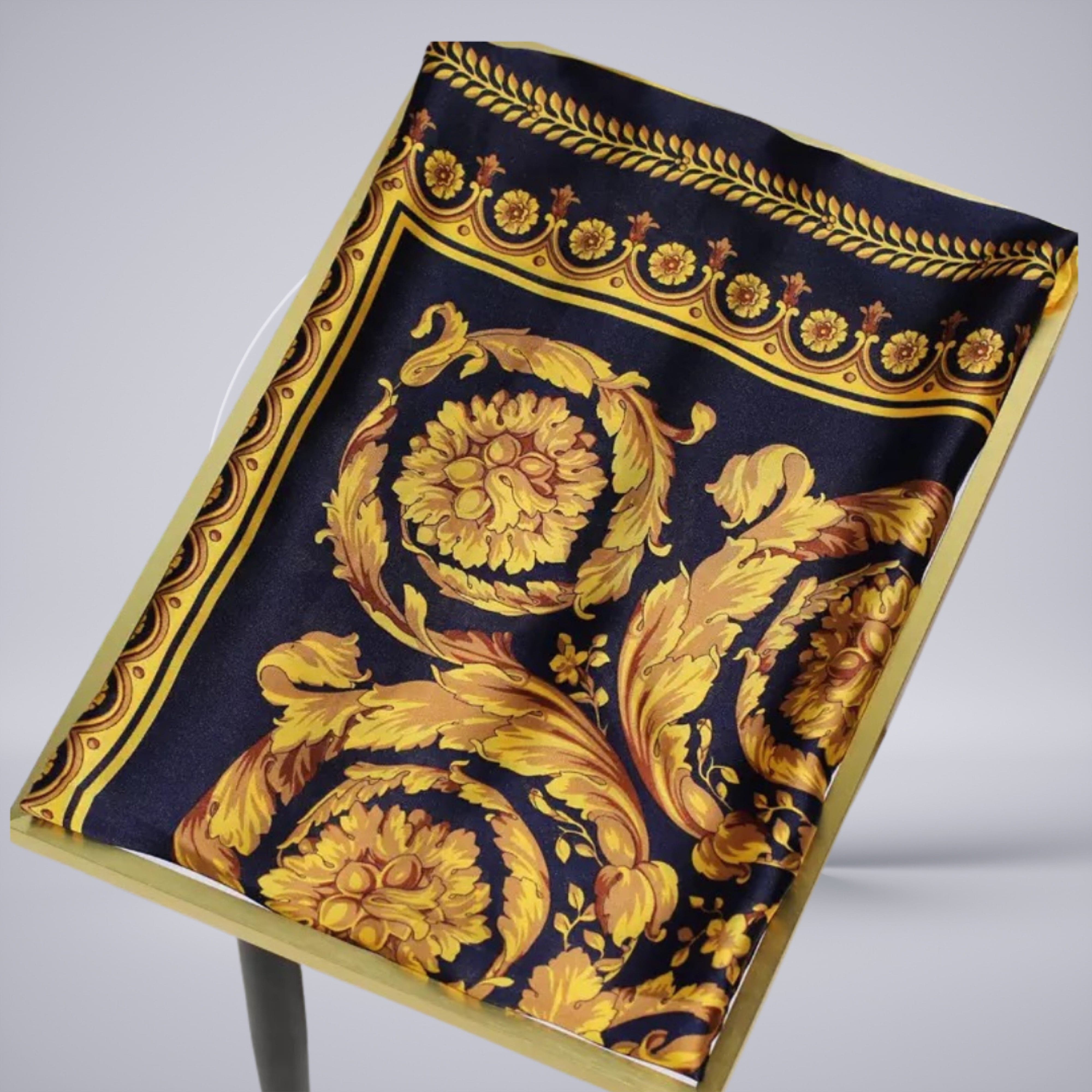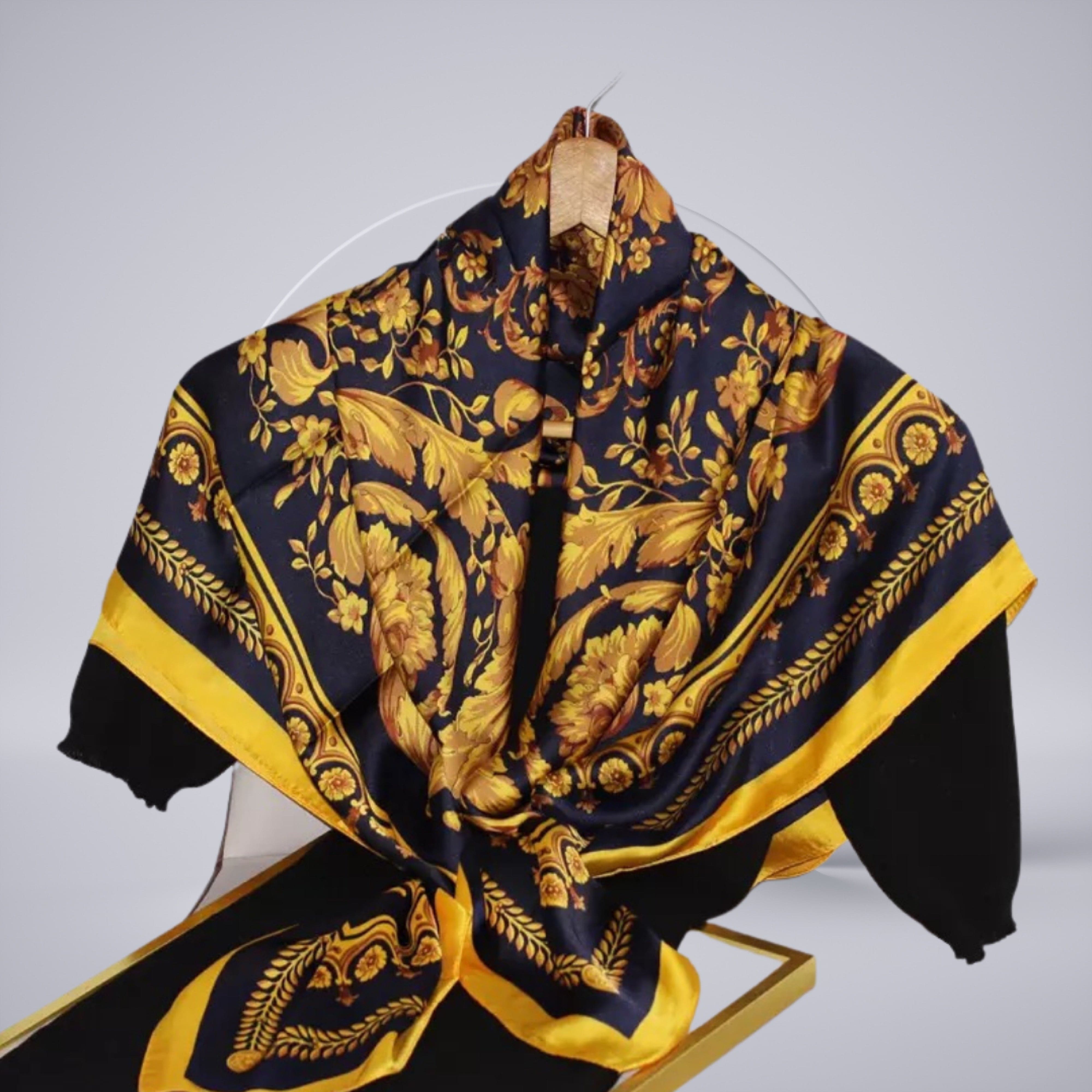 Amp up your look with this statement scarf. Featuring onyx and gold material with a contrasting print, we are obsessed. Team this with your existing pieces to complete the look.