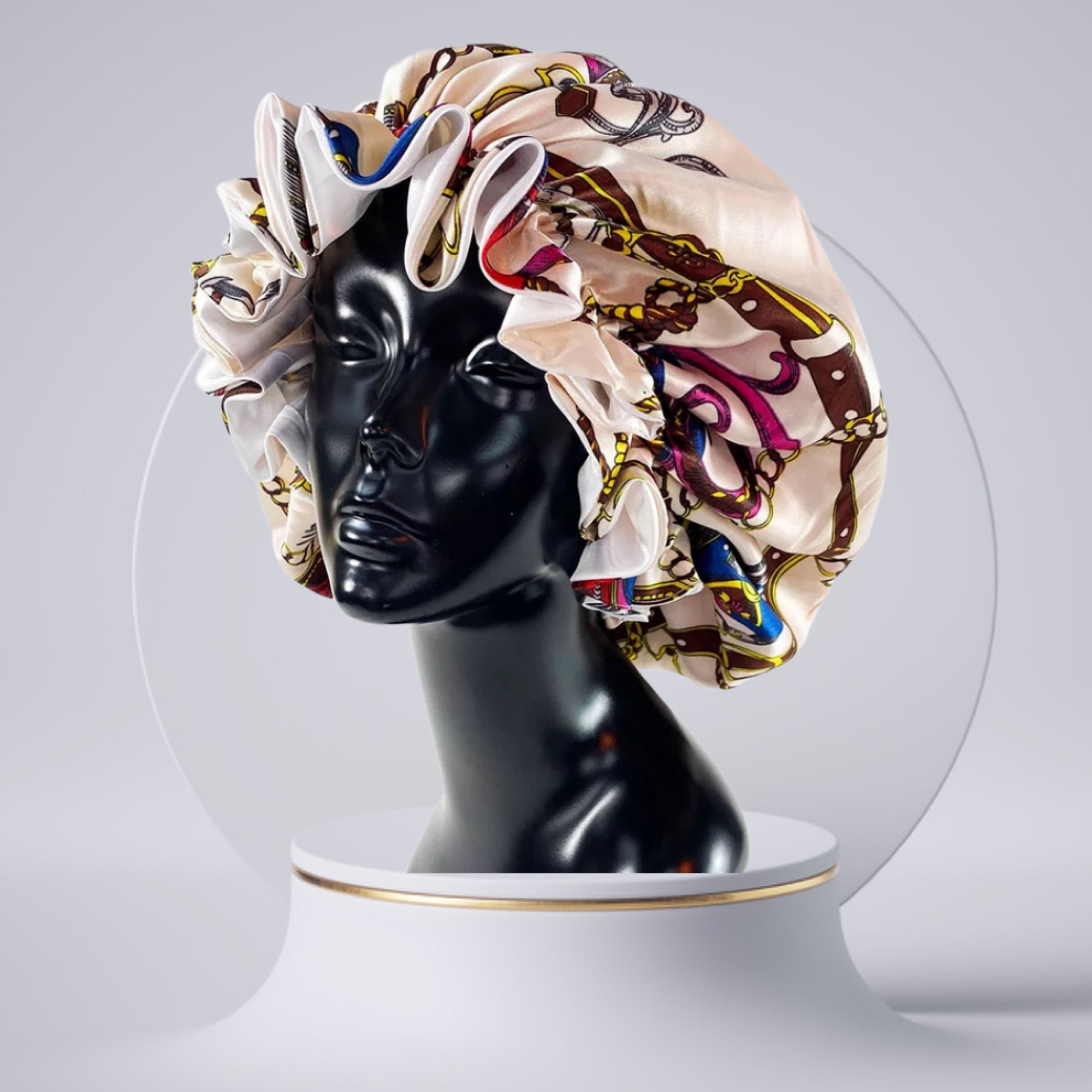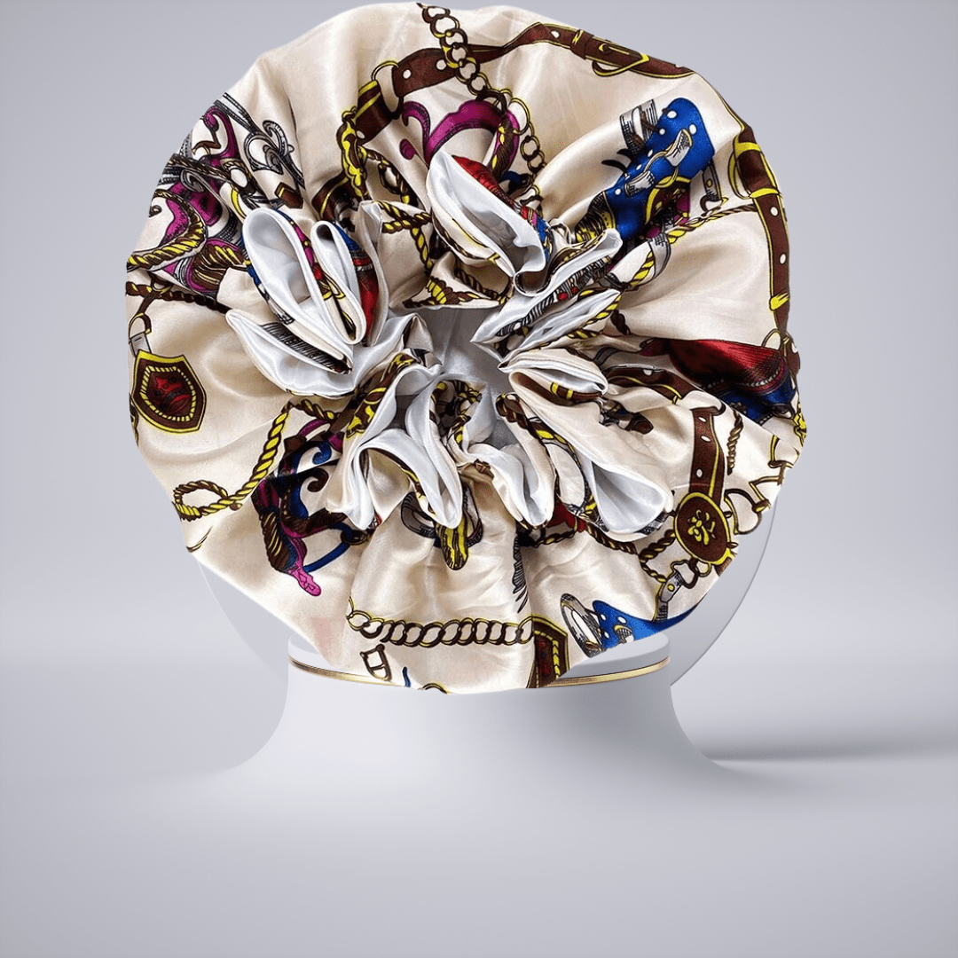 Our statement bonnet is more than an accessory; it's a fashion statement that demands attention. The satin material offers a touch of opulence against your skin, ensuring a delightful blend of indulgence and relaxation as you unwind in style. The carefully chosen prints add a playful and chic element, making this bonnet the perfect companion for your night PJs.