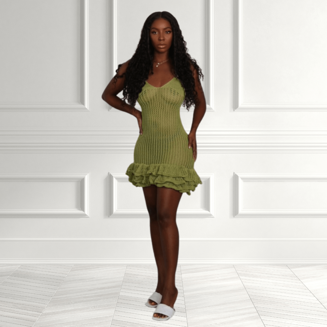Make a statement with our Green Crochet Knit Mini Dress. Crafted with a vibrant crochet knit and playful ruffle hem, it's a must-have for the new season. Don't miss the chance to own a dress that will redefine your style and set you apart from the crowd. Whether you're attending a beachside brunch, a garden party, or simply seizing the day, our Green Crochet Knit Mini Dress is your go-to choice. Order now and get ready to shine.