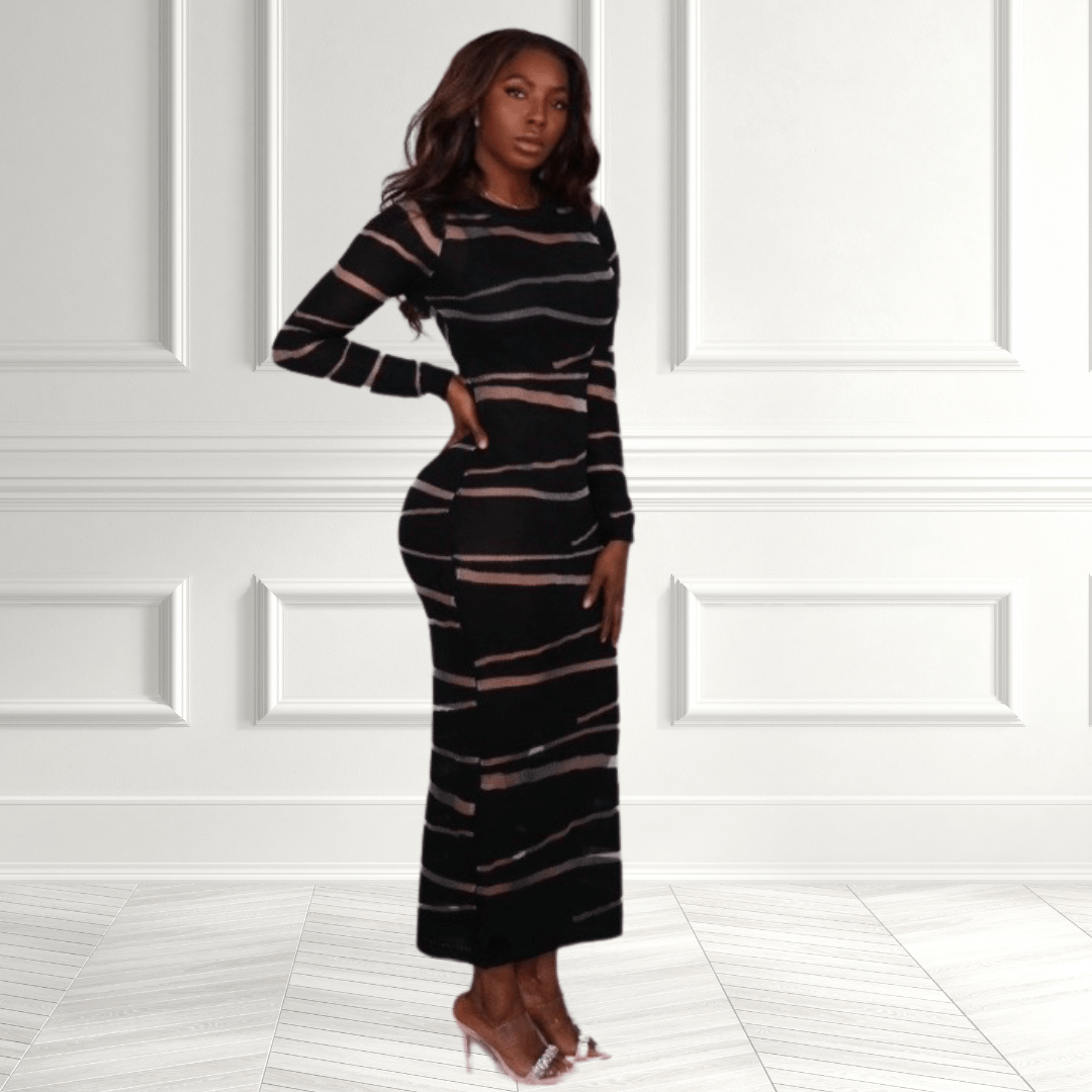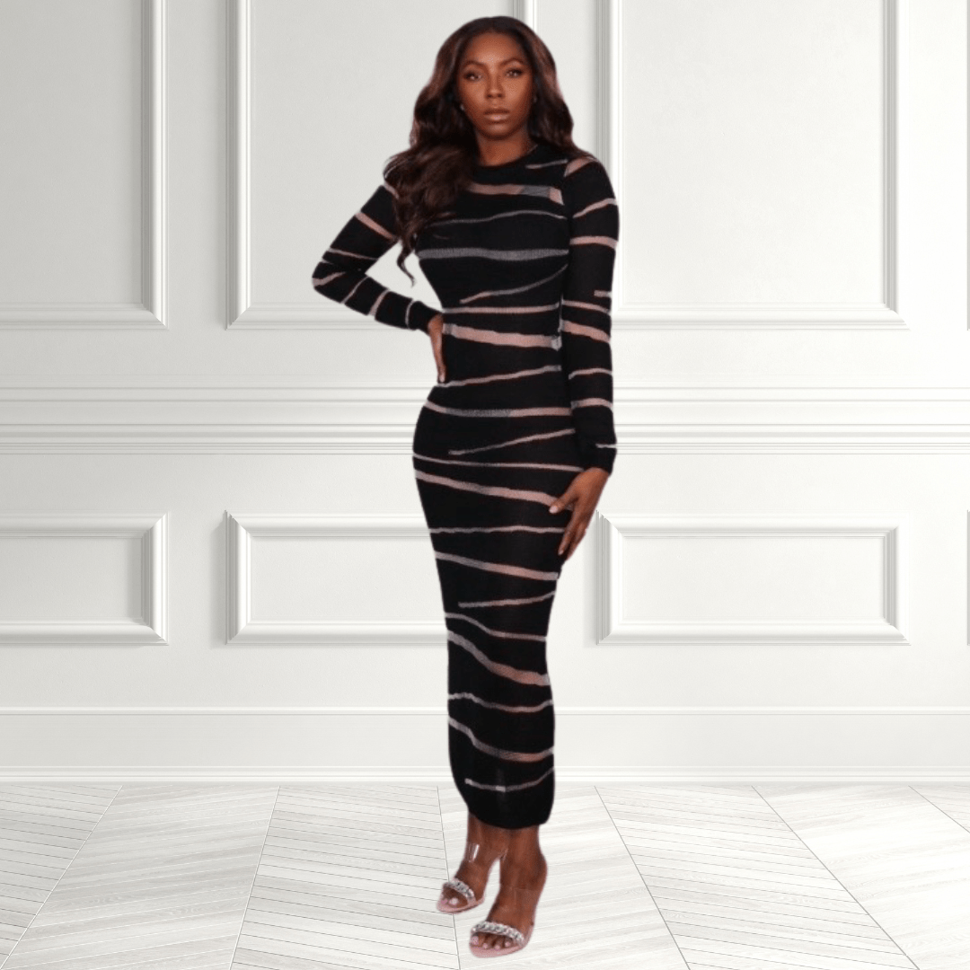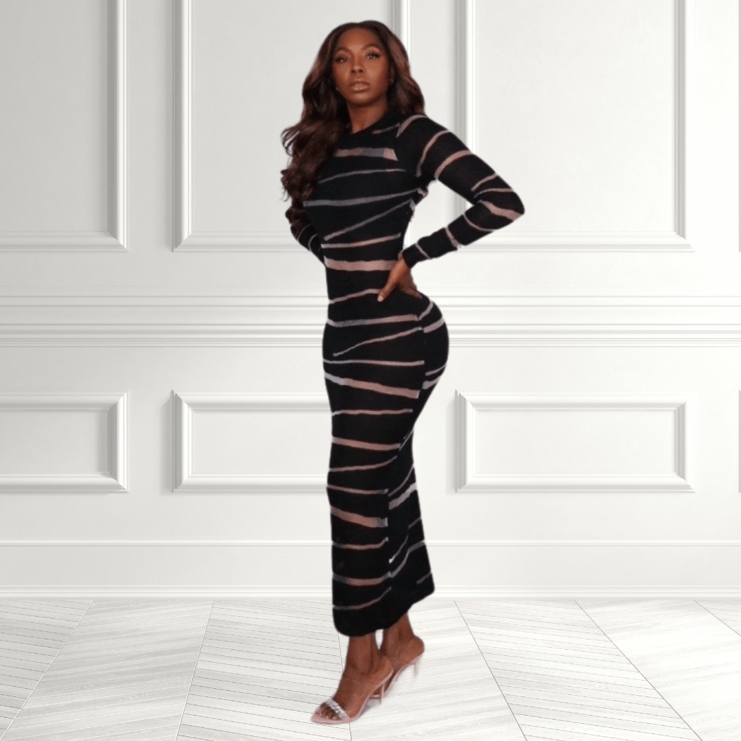 Elevate your style with our Illusion Knit Maxi Dress, meticulously crafted for comfort and sophistication. This enchanting piece boasts a stretch fabric, ensuring a perfect fit that accentuates your curves with grace.