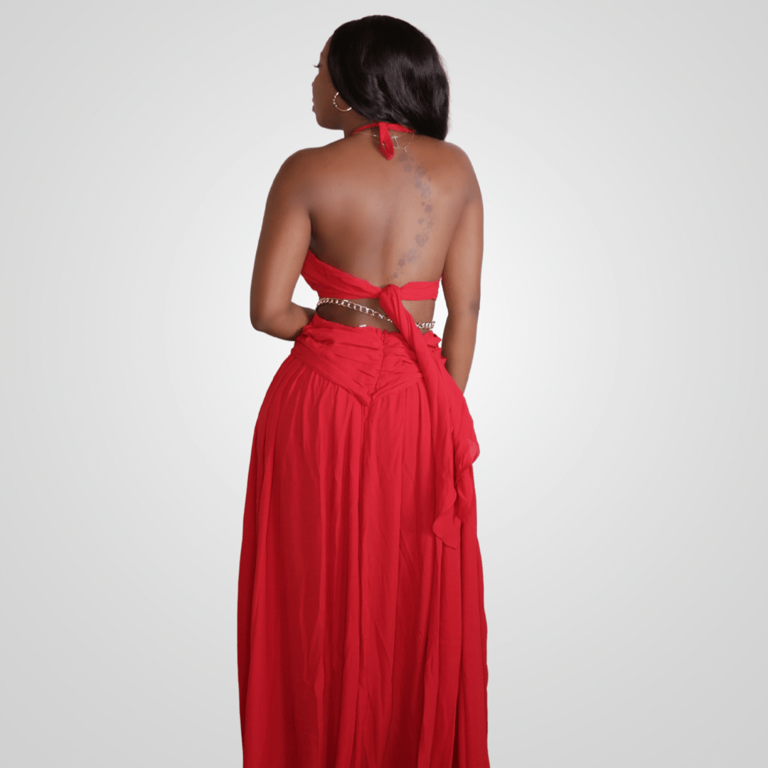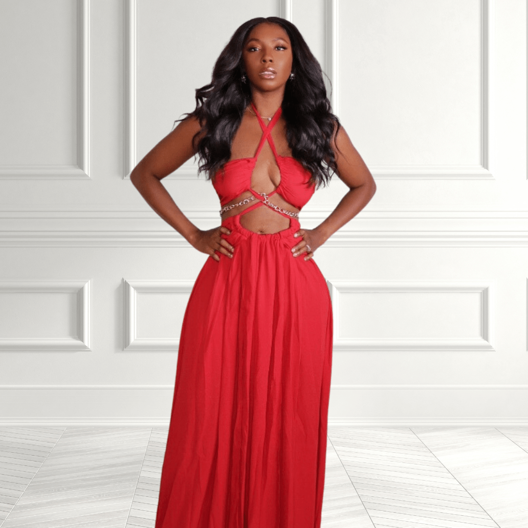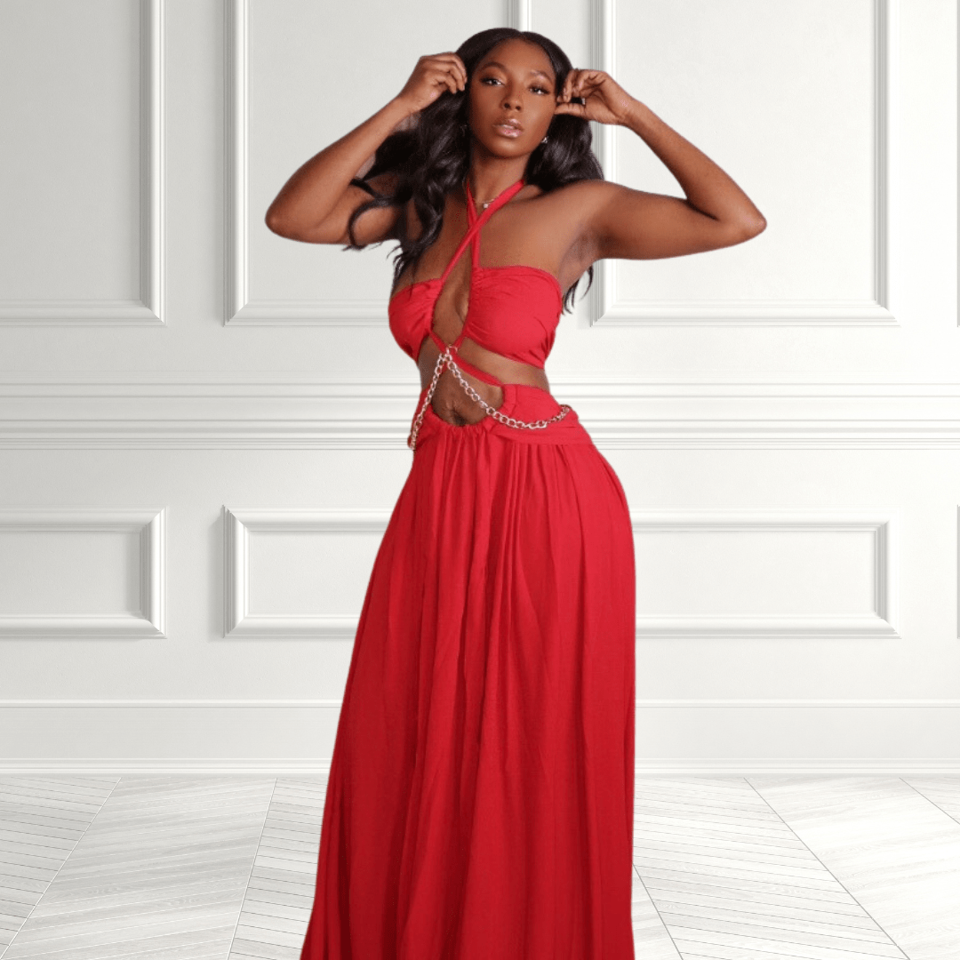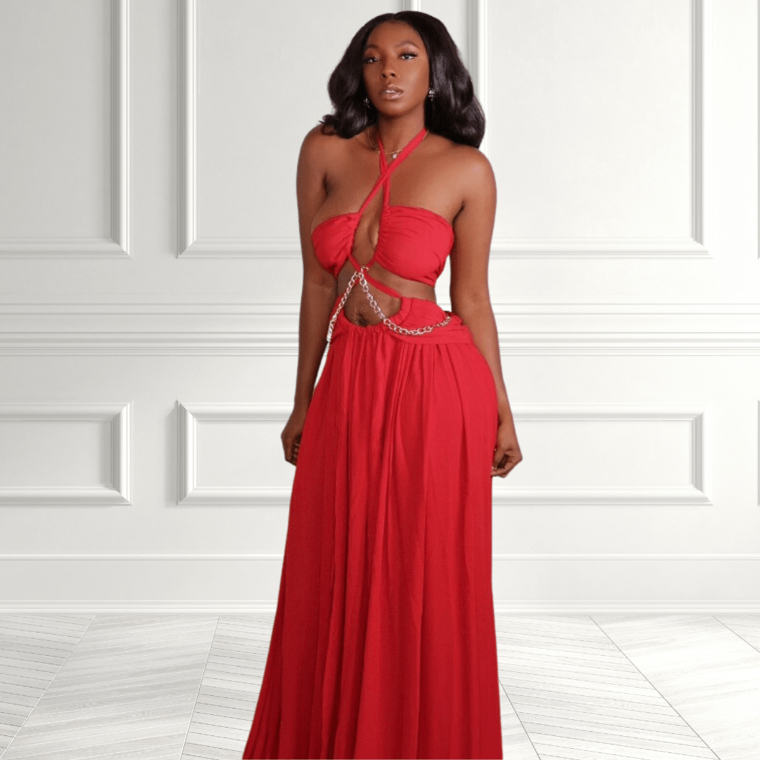 At ForeignGeh, we're all about celebrating your unique style and enhancing your figure. Our Hot Red Chain Maxi Dress is designed with you in mind, boasting figure and curve-enhancing tweaks to ensure the perfect fit. It's also tall girl-friendly, so you can embrace your height with confidence. Add a touch of luxury to your weekend ensemble with this stunning dress, featuring tie details around the neck and back adorned with a chain design, a chic thigh-high slit, and an elastic waist that complements your curves flawlessly. Shop now!