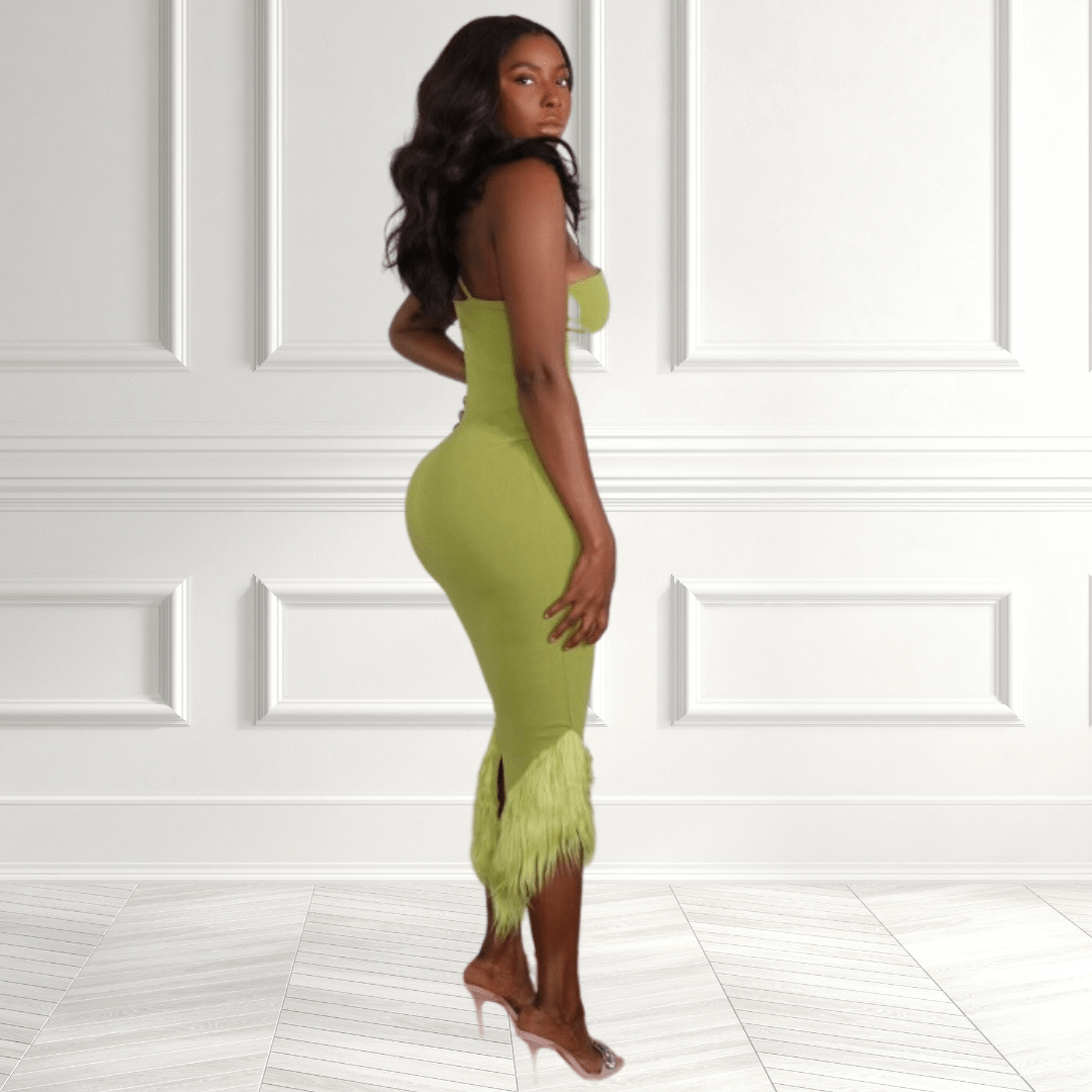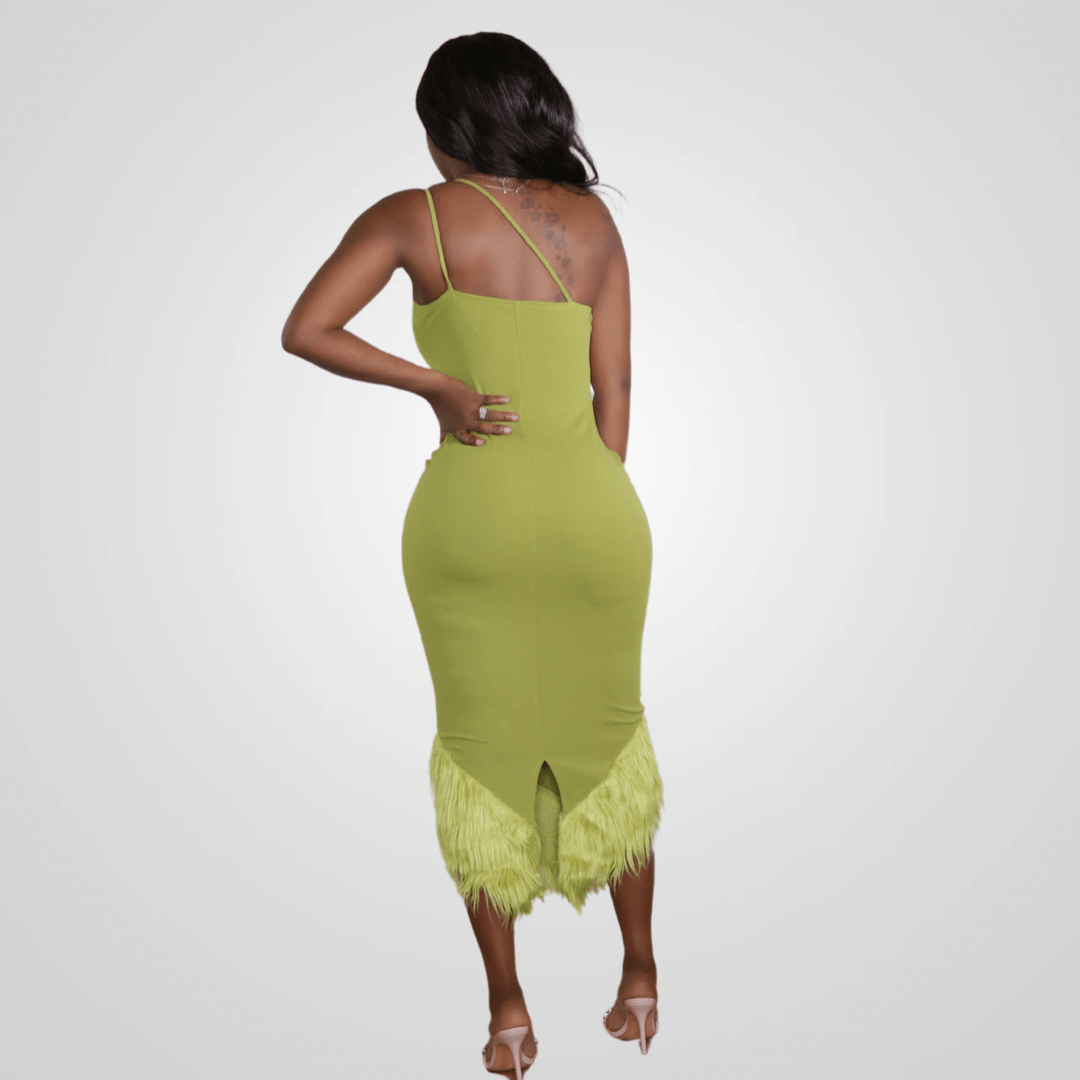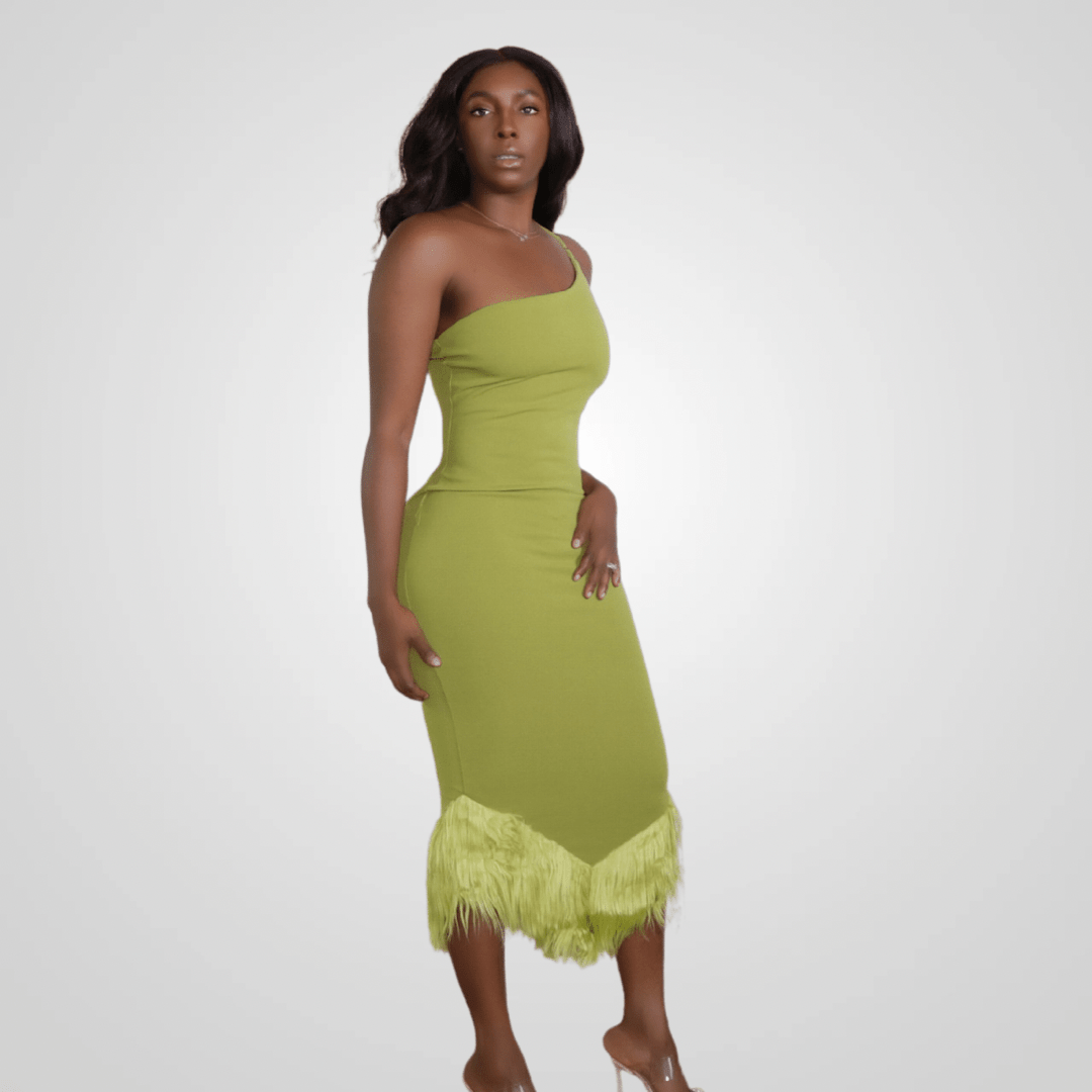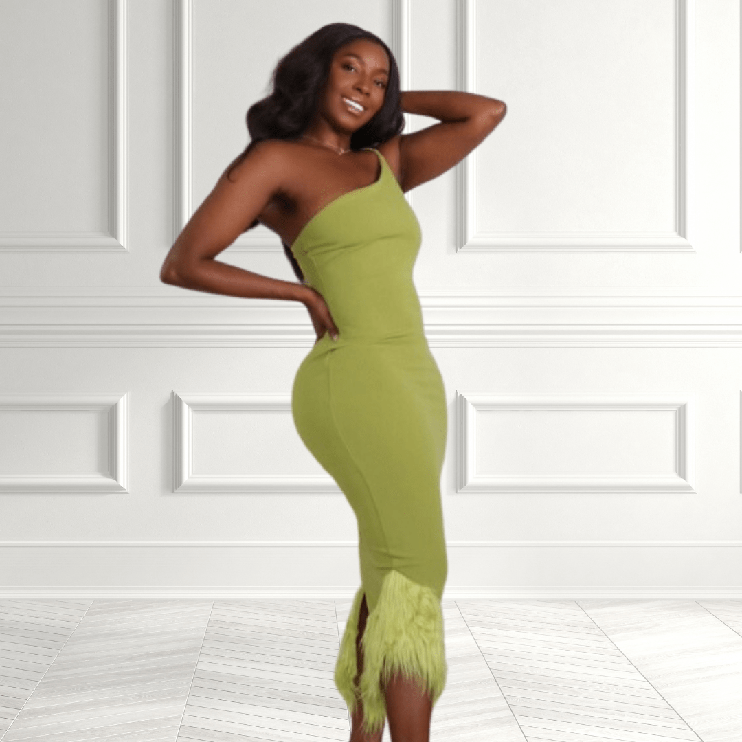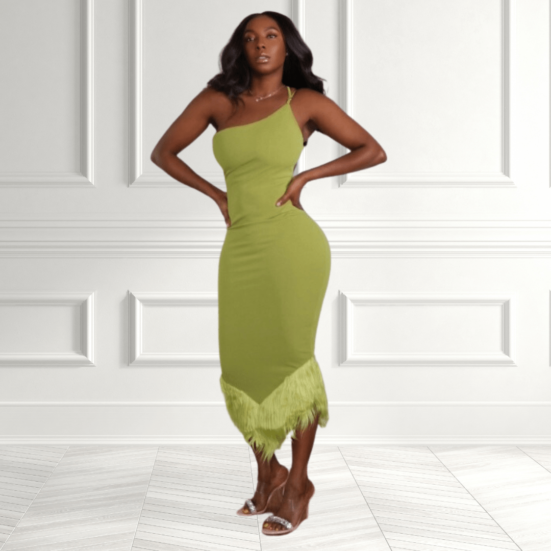 Celebrate your hourglass figure and elevate your glam wardrobe with our one-shoulder Feather Bottom Midi Dress. This dress is designed to enhance your curves and provide the perfect fit, offering a unique combination of style and comfort. With its stunning one-shoulder design, feather bottom detail, figure-flattering silhouette, and versatile midi length, this dress is your go-to choice for making a glamorous statement. Let's delve into the captivating details of this chic and fashionable ensemble. Order yours today and experience the perfect blend of fashion-forward design, comfort, and confidence.