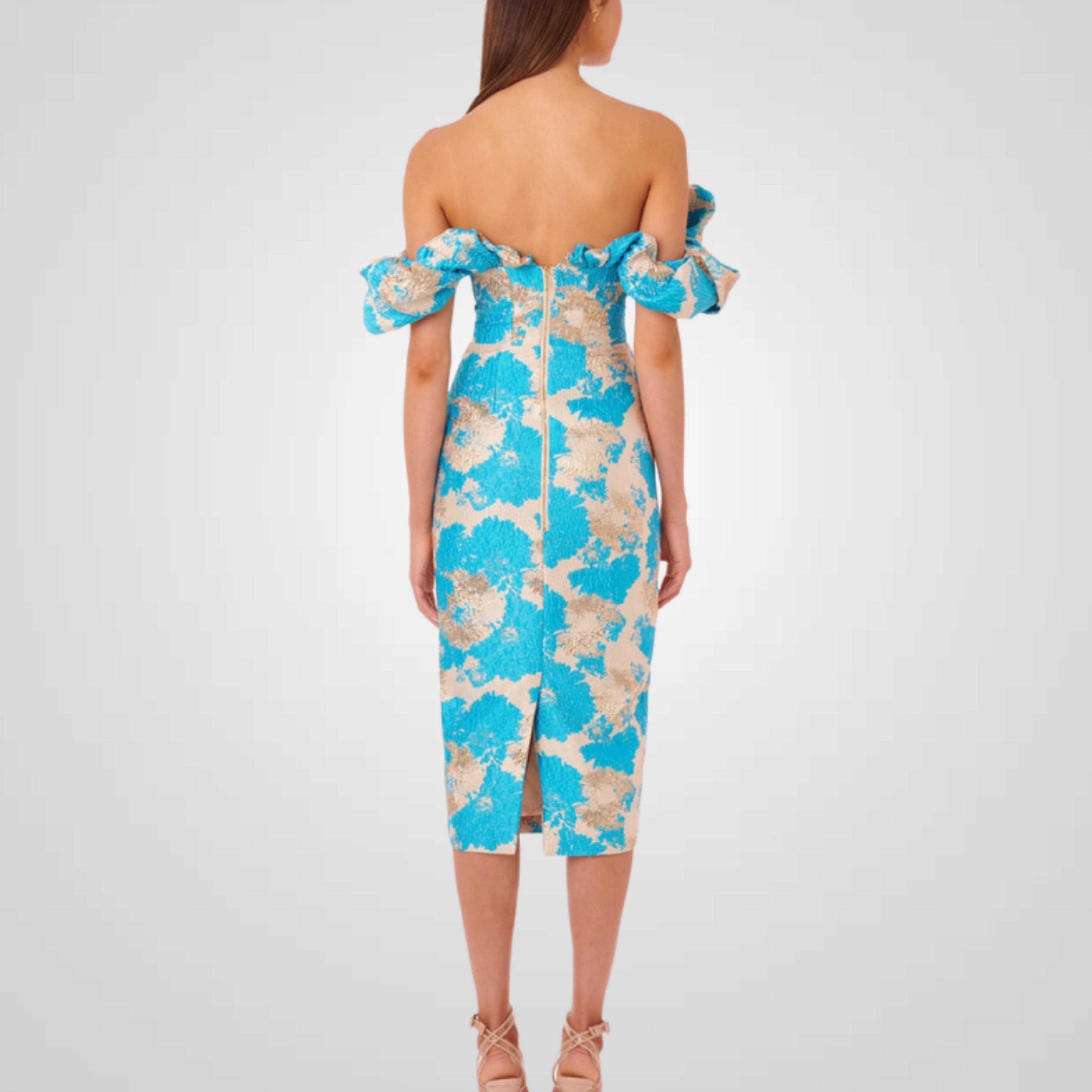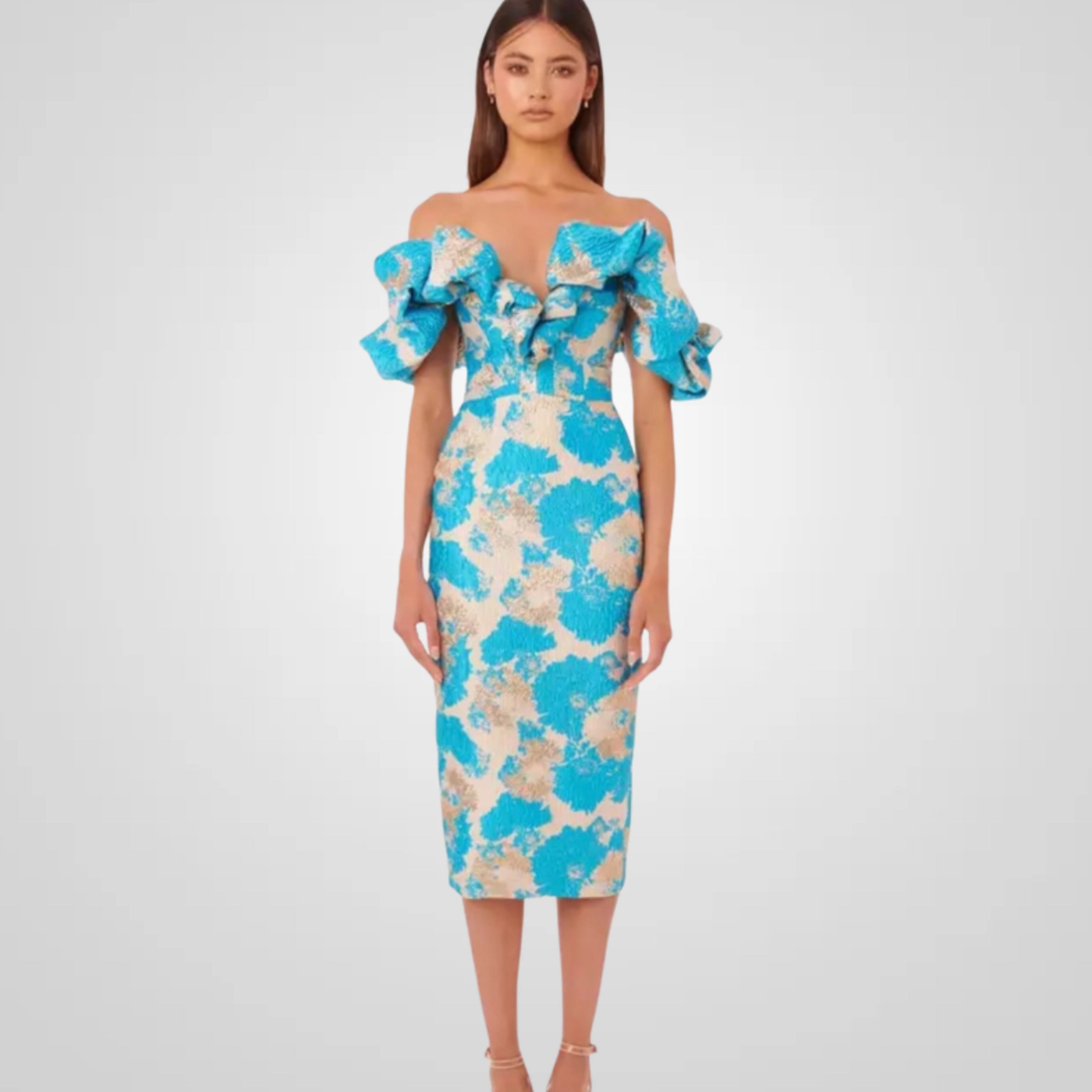 Prepare to step into the spotlight and make an unforgettable entrance in our ONCE UPON A DREAM Dress. This dress is designed to captivate hearts and turn heads, featuring vibrant Blue jacquard fabric, a figure-enhancing silhouette, extravagant flounced ruffles along the plunging neckline, and a chic draped off-the-shoulder detail. Whether you're attending a special event, gala, or evening soirée, this dress is your ticket to making a lasting impression. Order yours today and experience the perfect blend of fashion-forward design, confidence, and elegance.