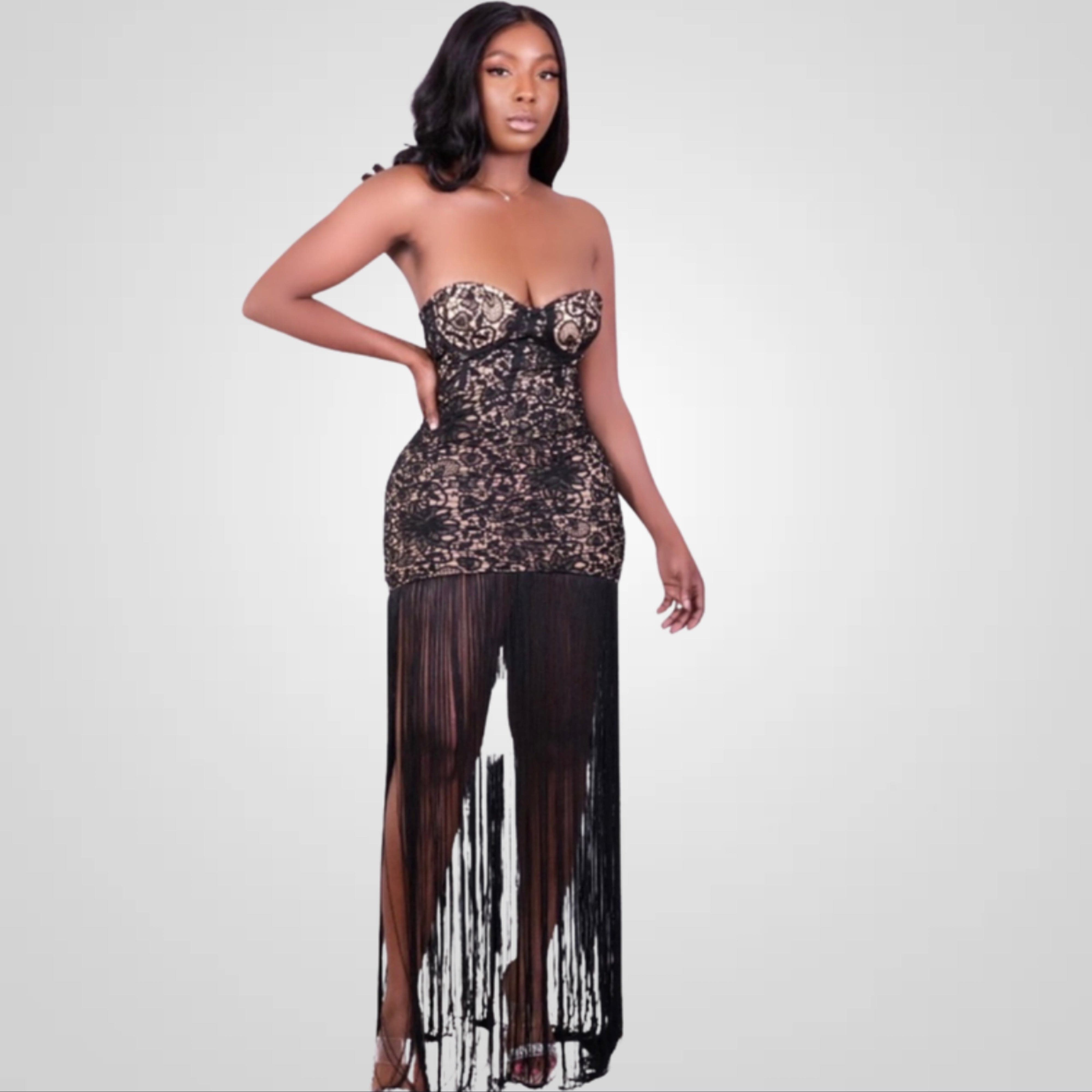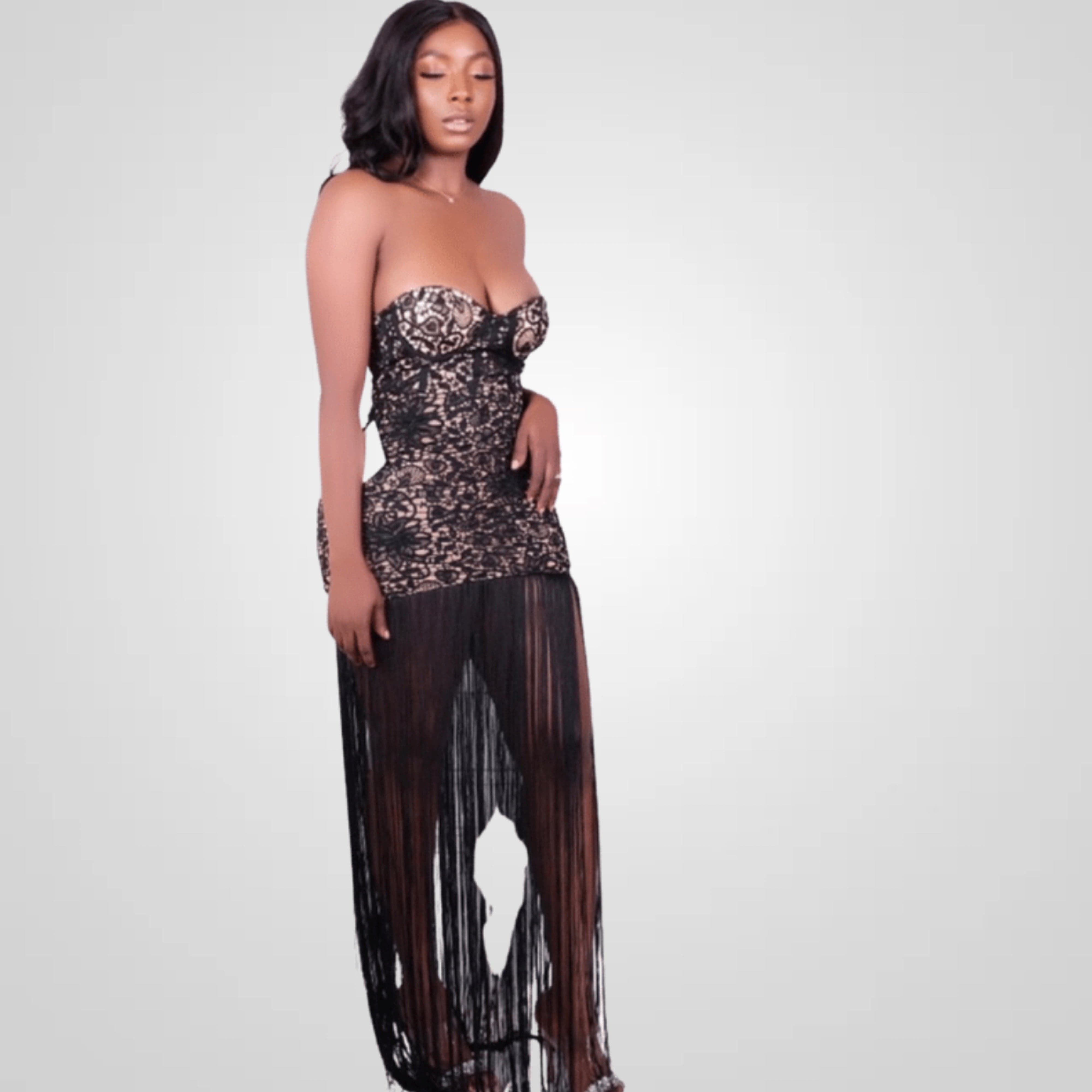 Our ForeignGeh Lace Fringe Hem Dress is tailored with your figure in mind, featuring thoughtful enhancements for the perfect fit. Get ready to be both classic and fierce this season with a dress that exudes confidence and style. Order now to make a bold fashion statement, celebrate your curves, and capture the essence of classic sophistication with a fierce twist.