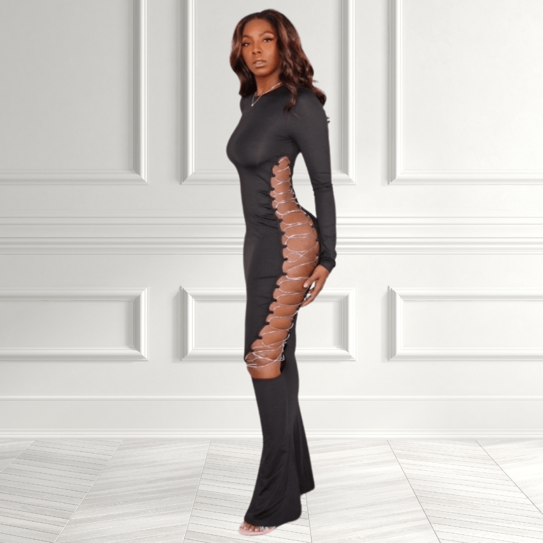Introducing our exquisite long-sleeved bodycon Little Black Maxi Dress, a captivating blend of elegance and allure. Crafted for the modern fashionista, this dress boasts a high neckline and intricate lace-up detailing, ensuring a sophisticated yet daring look. The show-stopping feature is a massive cutout that gracefully stretches from the ribs down to the knee, making it a bold statement piece for the confident trendsetter.