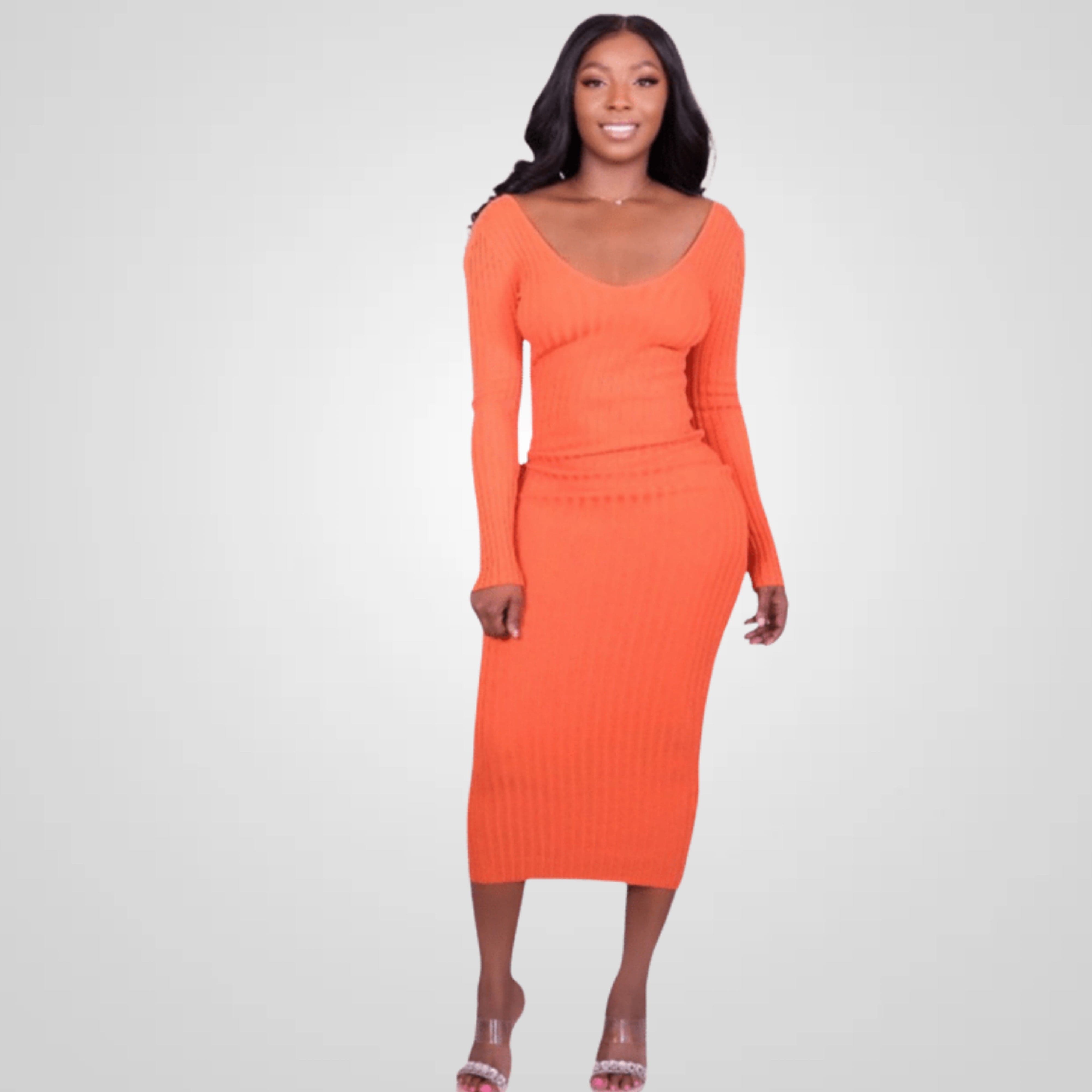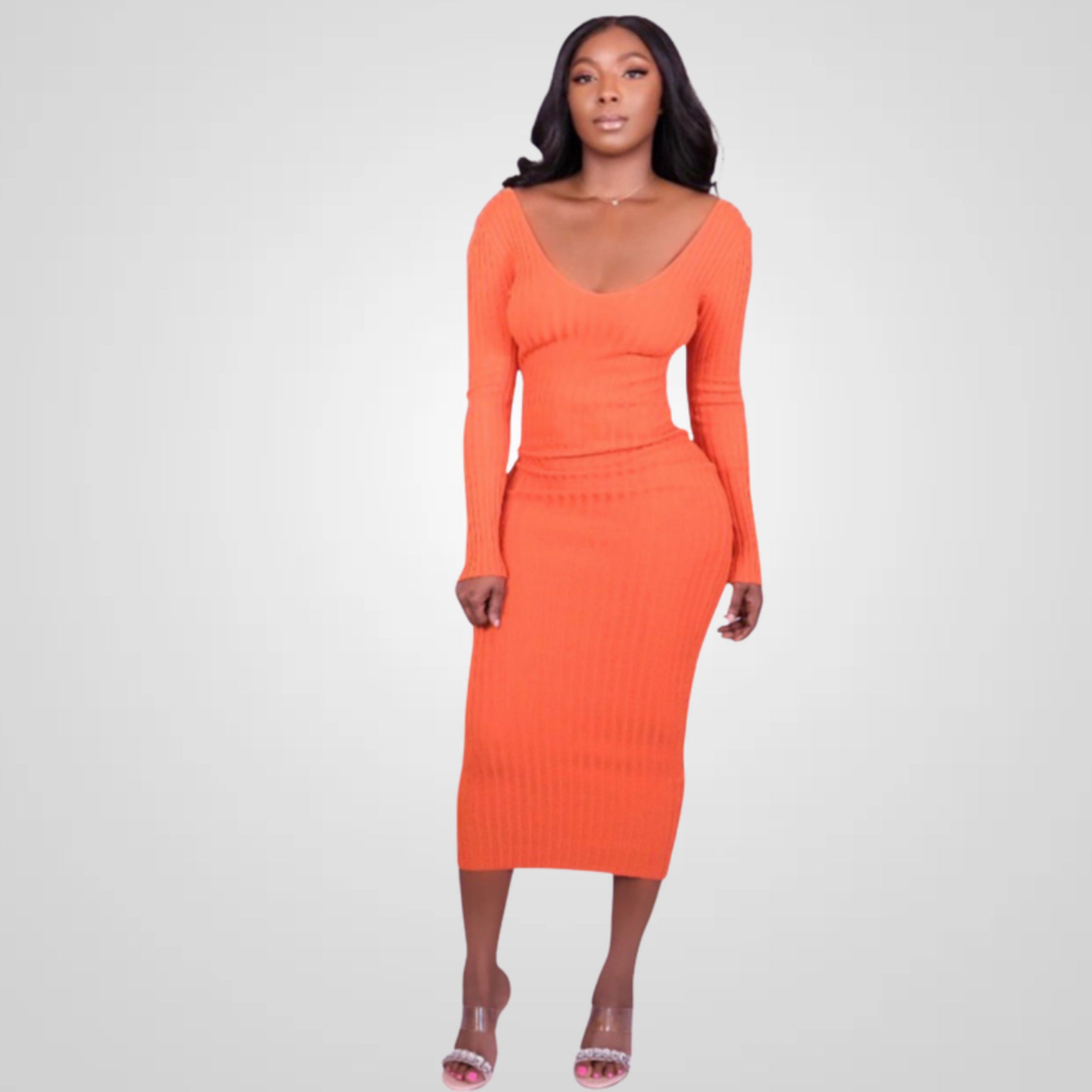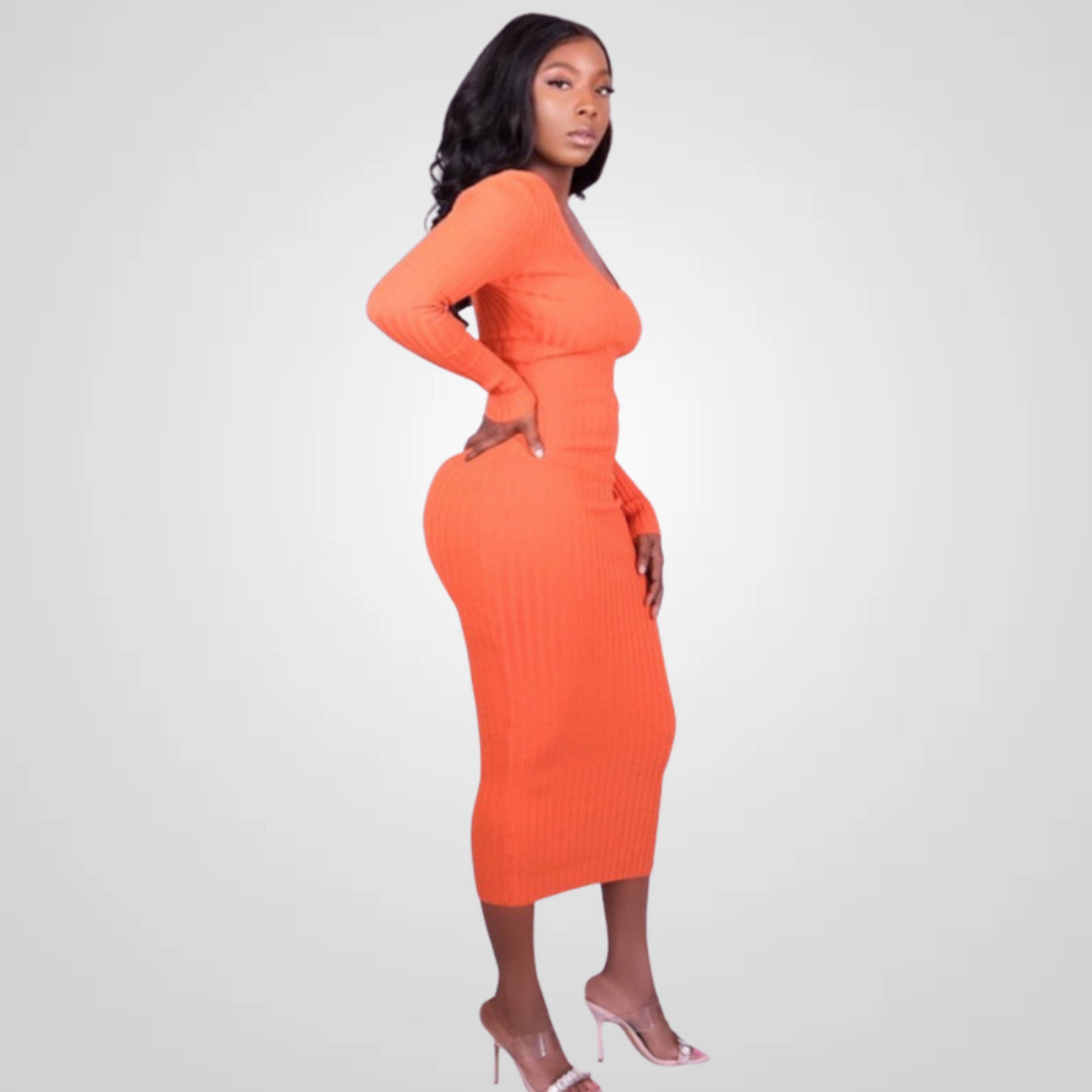 Introducing the ForeignGeh Orange Rib Midi Dress, a fashion-forward choice designed to celebrate your hourglass figure and provide the perfect fit. This dress is everything you'll love for the new season, featuring an eye-catching ribbed orange material, long sleeves, and the option to wear it as a V-neck or off-shoulder style. Get ready to enhance your curves and elevate your style effortlessly. Order yours today and experience the perfect blend of fashion-forward design, comfort, and curve-flattering elegance.