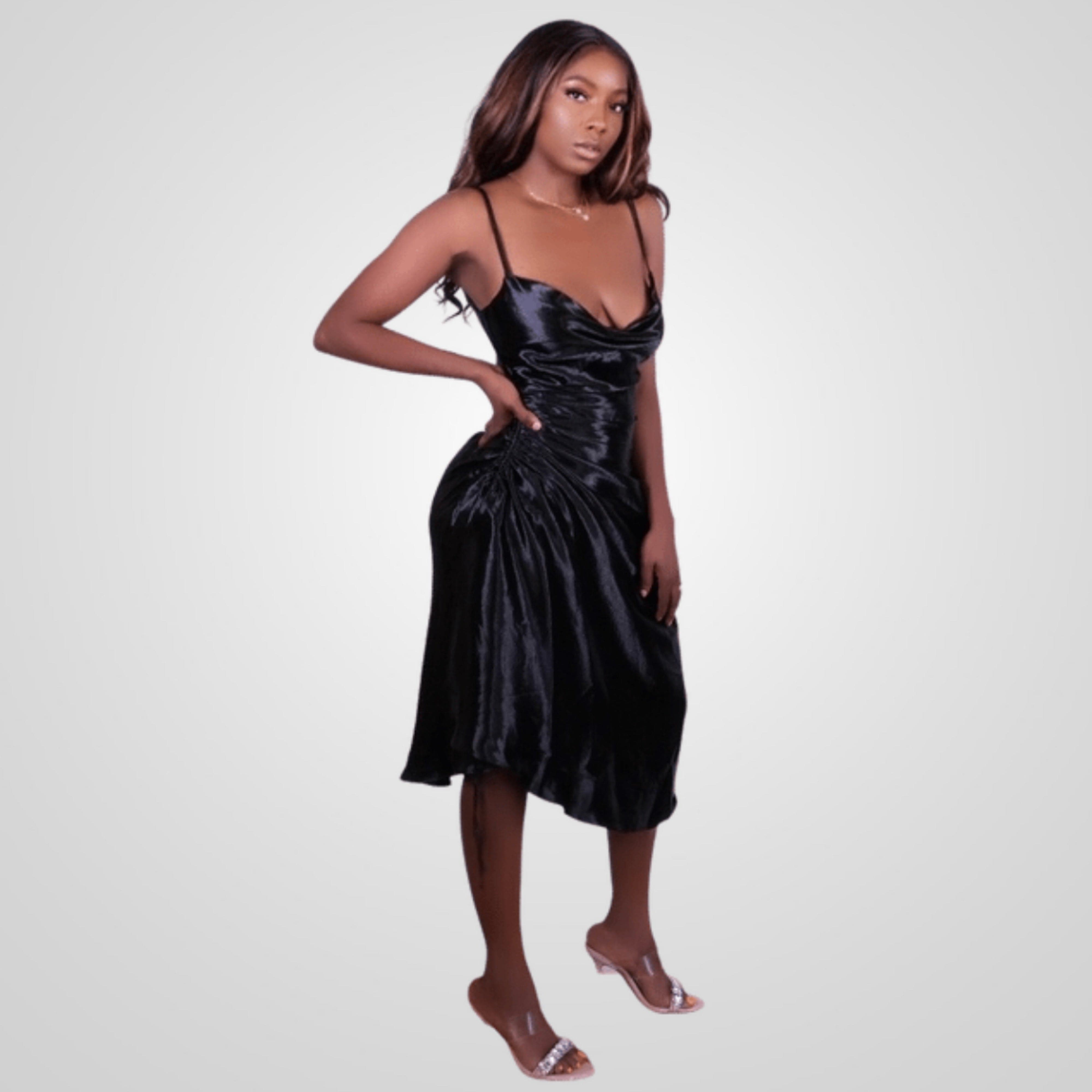 Every wardrobe deserves a touch of flirty elegance, and Monrovia is the perfect addition to yours. This slinky slip dress is designed to make you feel confident and effortlessly stylish. Crafted from a luxurious, none-stretch sexy black colored silk, Monrovia boasts adjustable ruched sides and straps, allowing you to tailor the fit to your liking. Whether you choose to dress it up with heels or embrace a more casual look with this season's trainers, Monrovia in its captivating emerald color is ready to elevate your style. Let's delve into the enchanting details of this versatile dress.