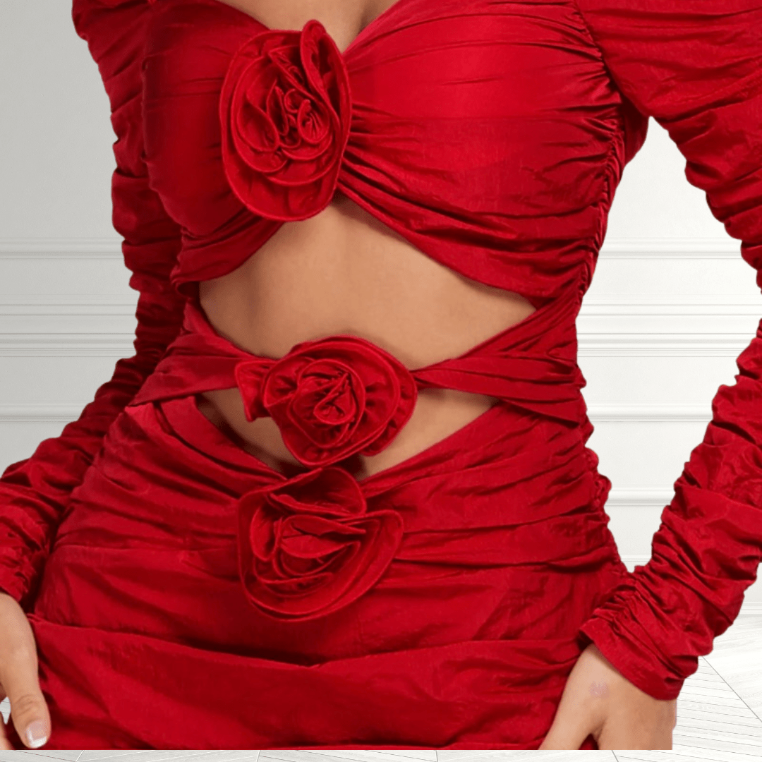 Elevate your wardrobe with this striking red mini dress, a true standout piece. The scrunchie long sleeves and rose accent cutout details add a touch of glamour to your look. Featuring a sweetheart neck, concealed back zip, and padded bust for a flattering silhouette. The ruched skirt and elasticized sleeves bring a unique flair. Make a bold fashion statement with this dress that seamlessly blends style and sophistication. Shop Now!