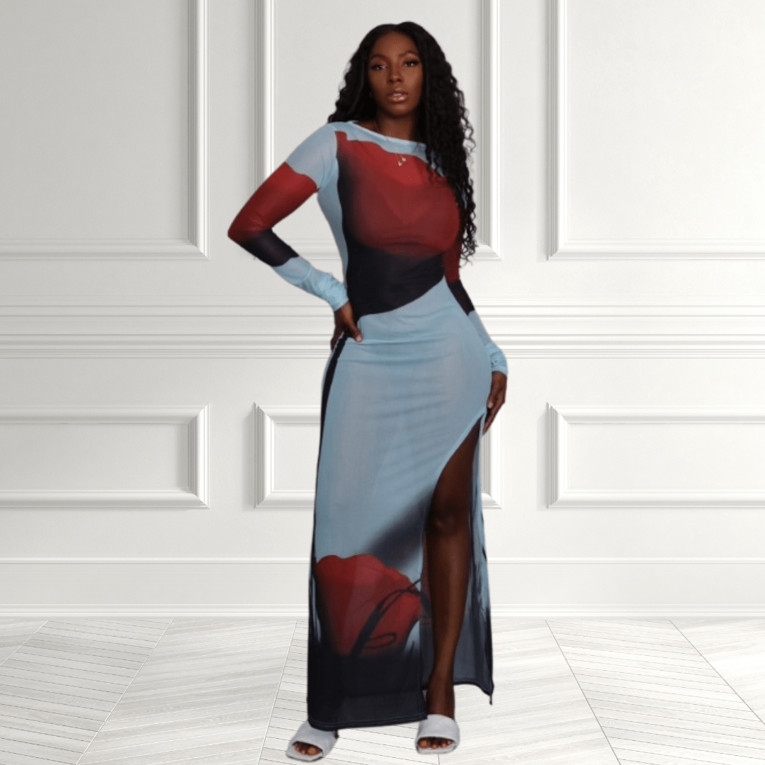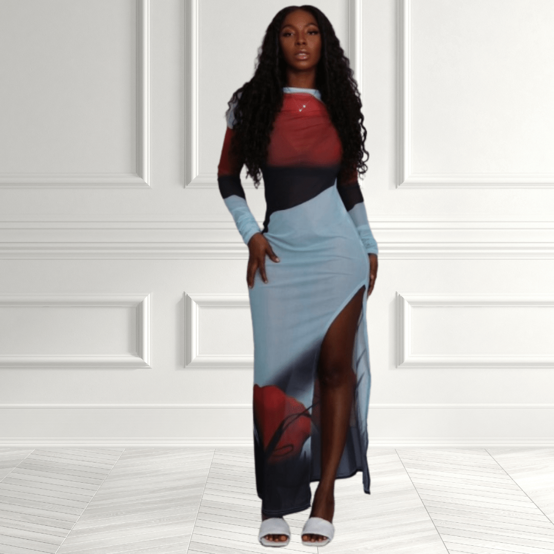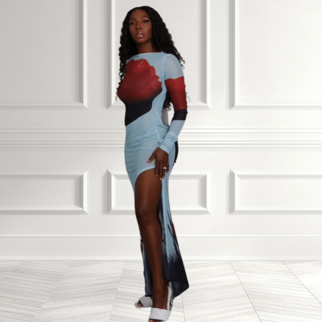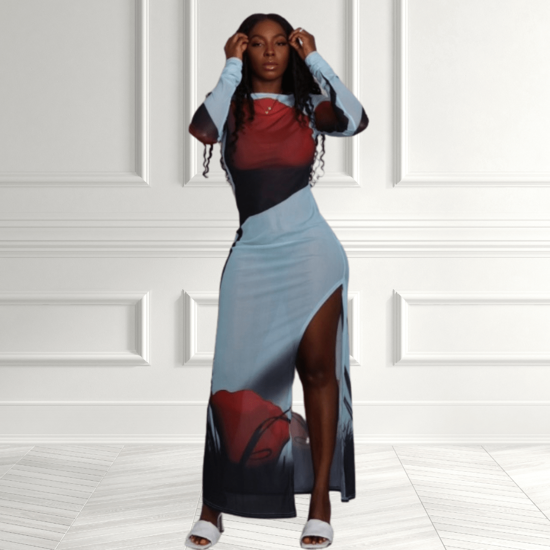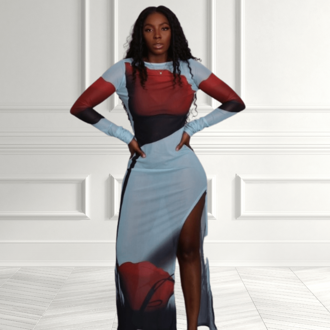 Dive into unparalleled elegance with our Sexy Blue Long Sleeve and Rose Mesh Maxi Dress. Captivate every gaze with this enchanting ensemble that seamlessly blends allure and sophistication. Crafted to perfection, this dress features a sultry silhouette, long sleeves for added flair, and intricate rose mesh detailing for a touch of romance.