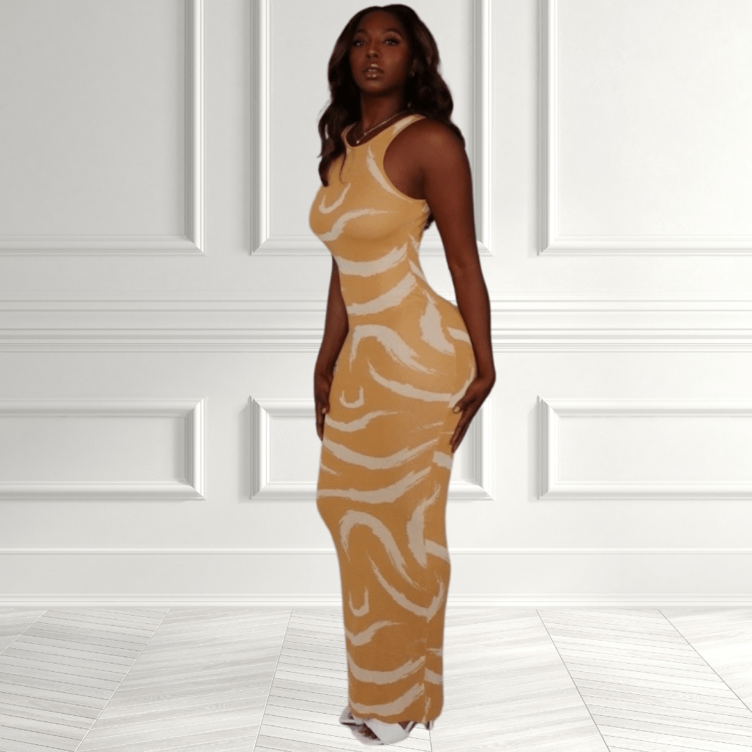 Elevate your style with the Chosen Knit Abstract Maxi Dress in Mustard. Immerse yourself in the allure of delicate knit and captivating abstract prints, showcased in this sleeveless sensation. The dress, featuring intricate detailing and a convenient back zipper closure, seamlessly combines elegance with comfort. Unleash your confidence in a dress that's not just a statement but a stretchy symbol of sophistication.