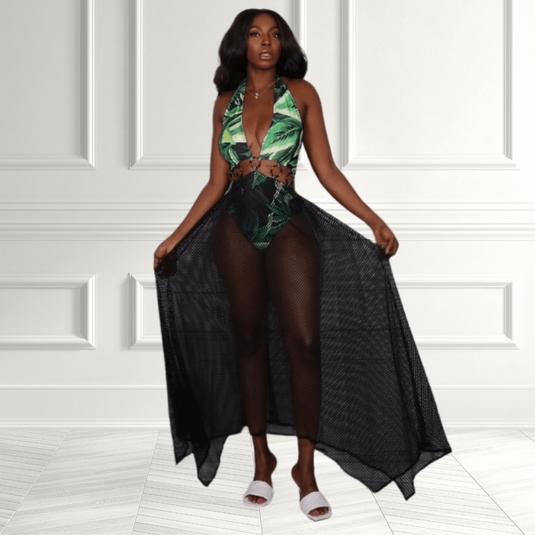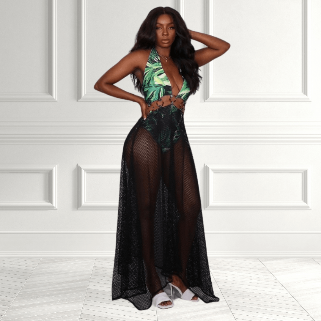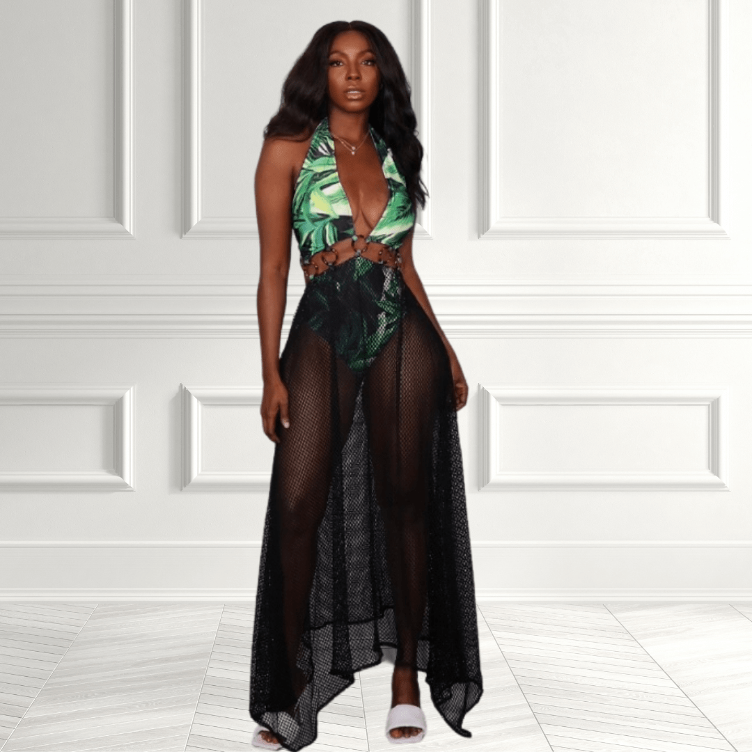 This Resort-Ready look features a halter top that self-tie in the back and tops a maxi skirt. Tortoise O-Rings connect the top to the mesh maxi skirt which shows off the matching bodysuit underneath.